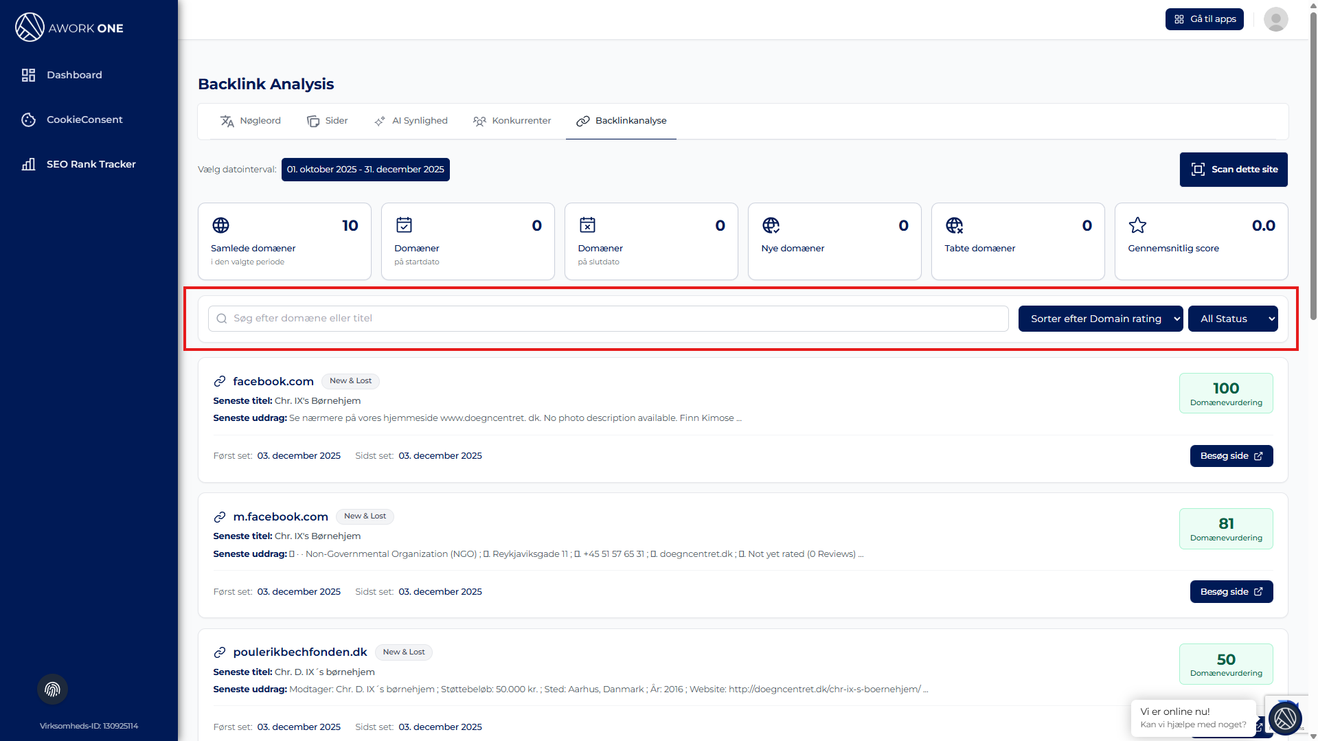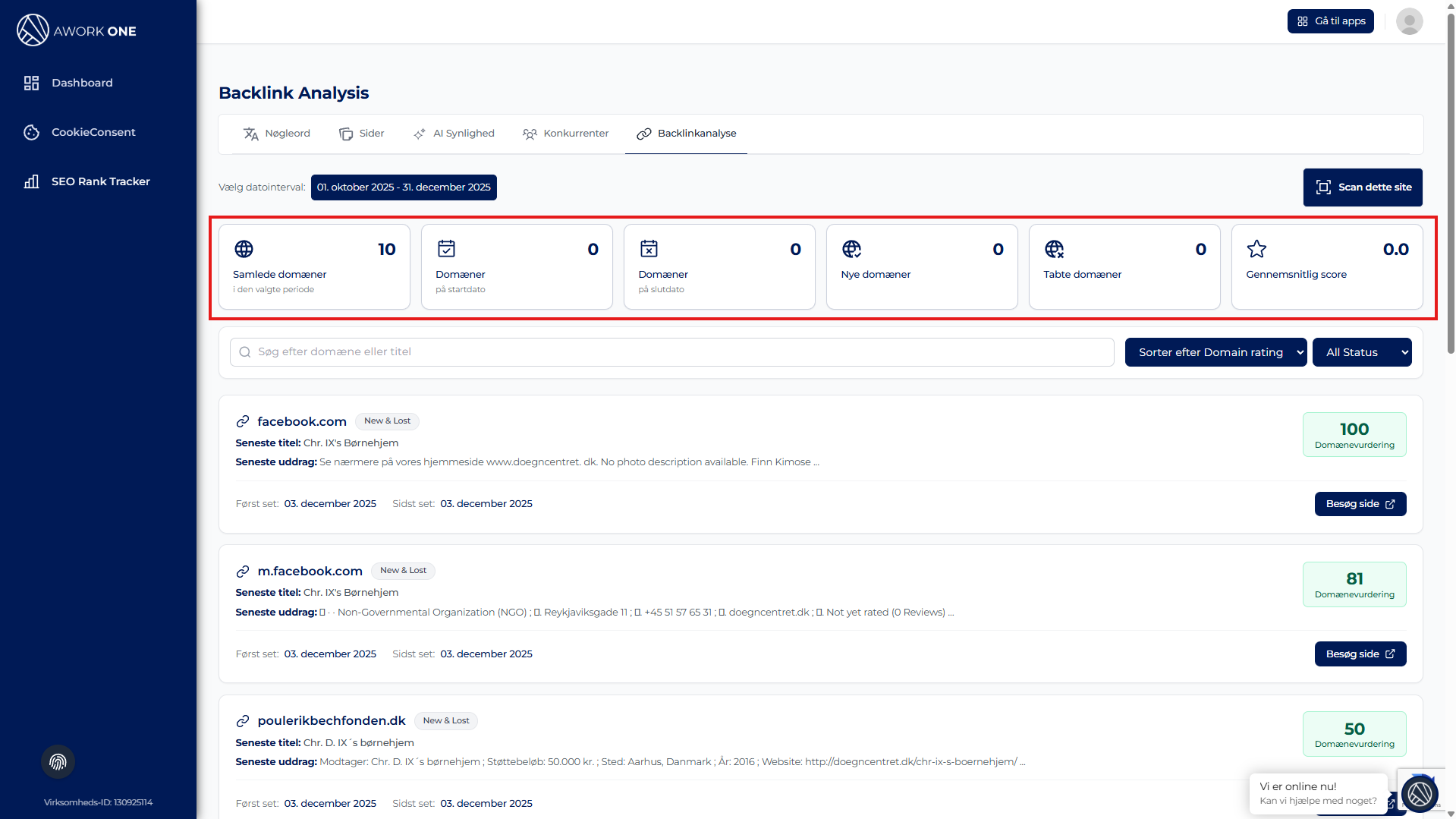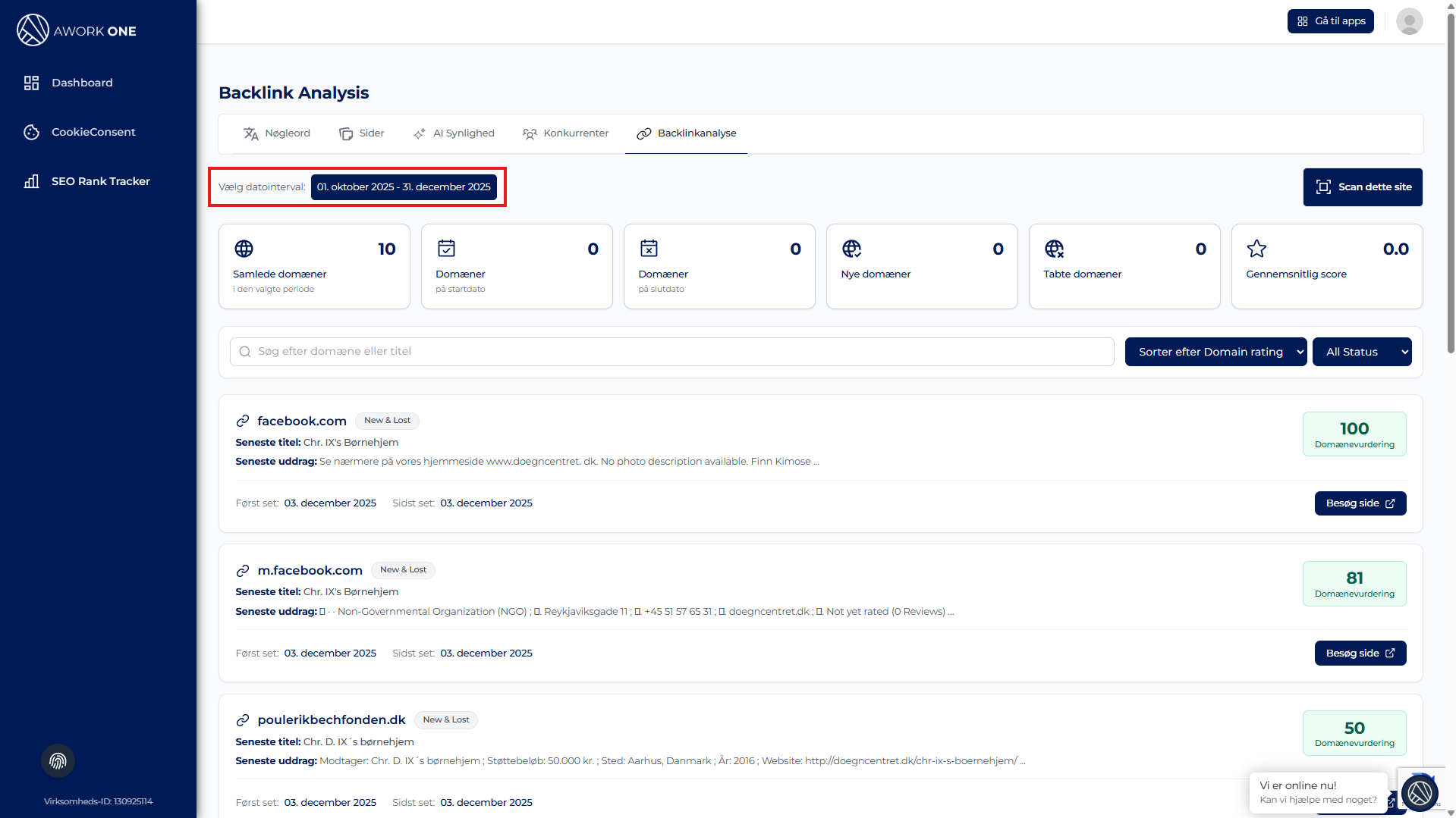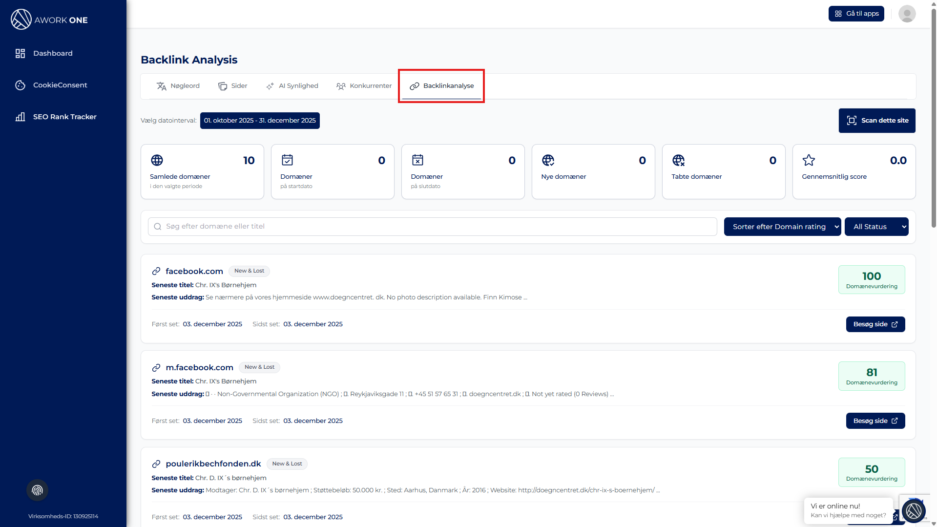 Dashboardet opdateres automatisk og viser backlink-data for den valgte periode.
