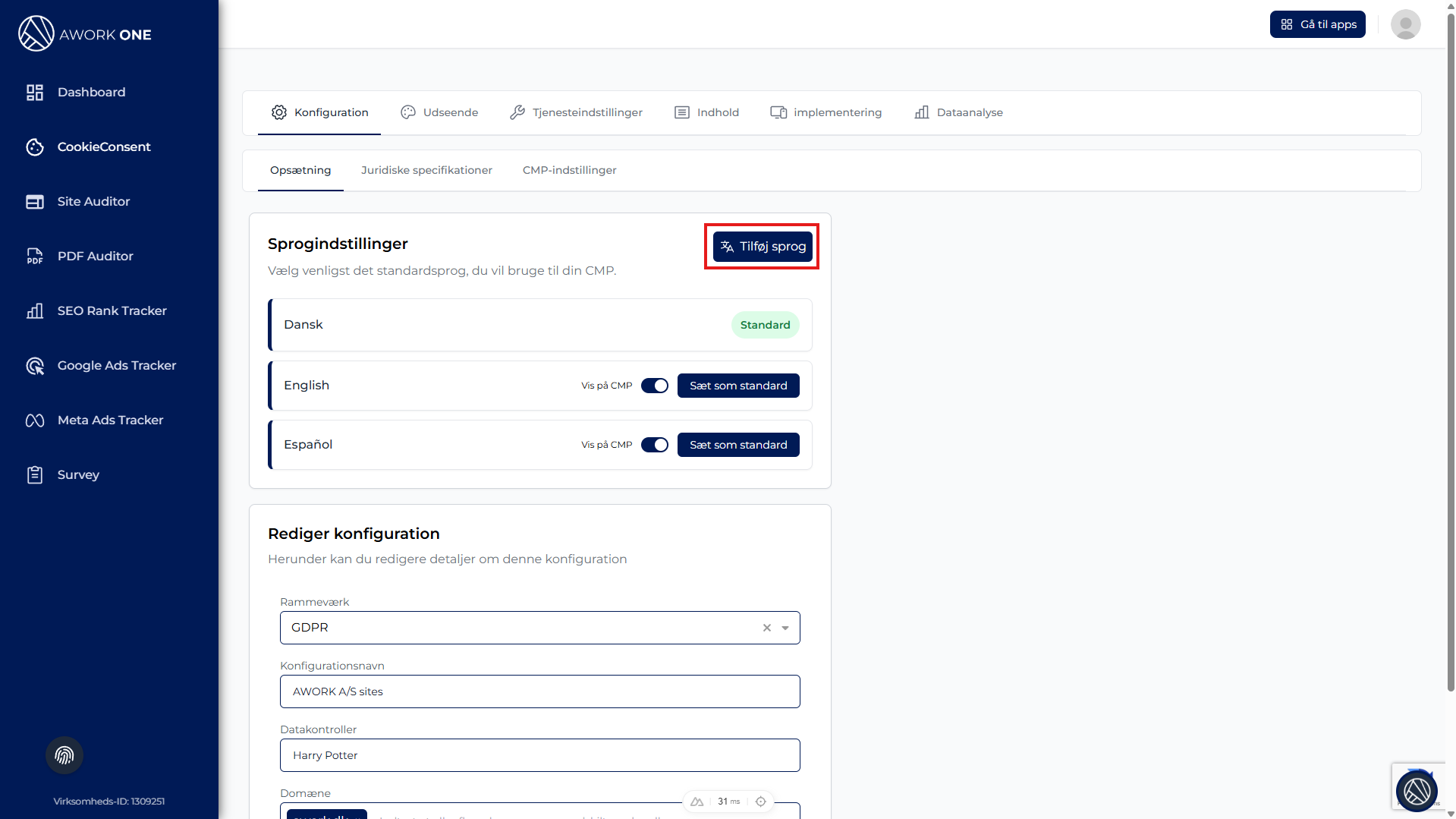 Konfiguration → Opsætning → Sprogindstillinger.