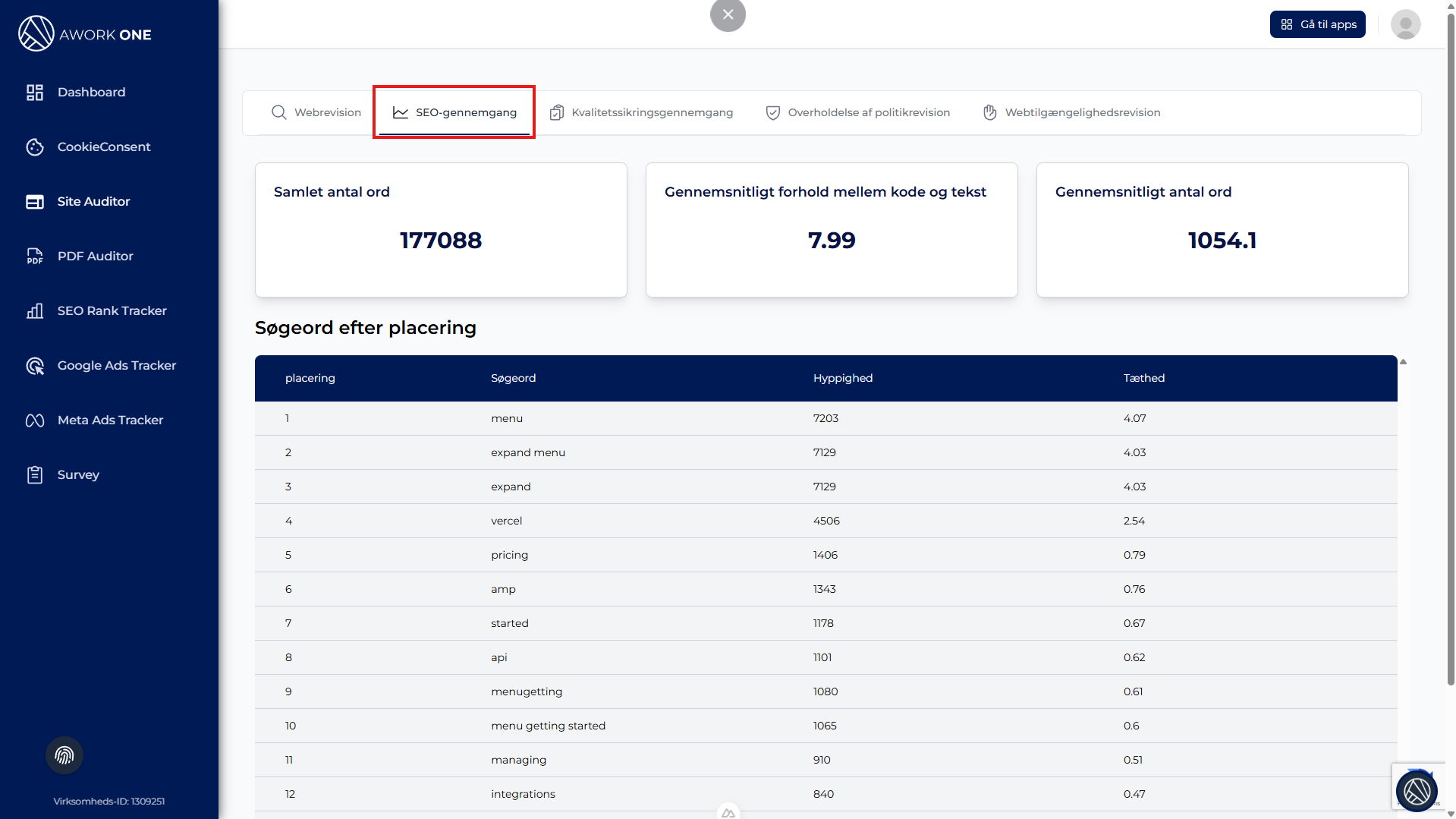 Trin 3: Audit-dashboardet for det valgte website åbnes.