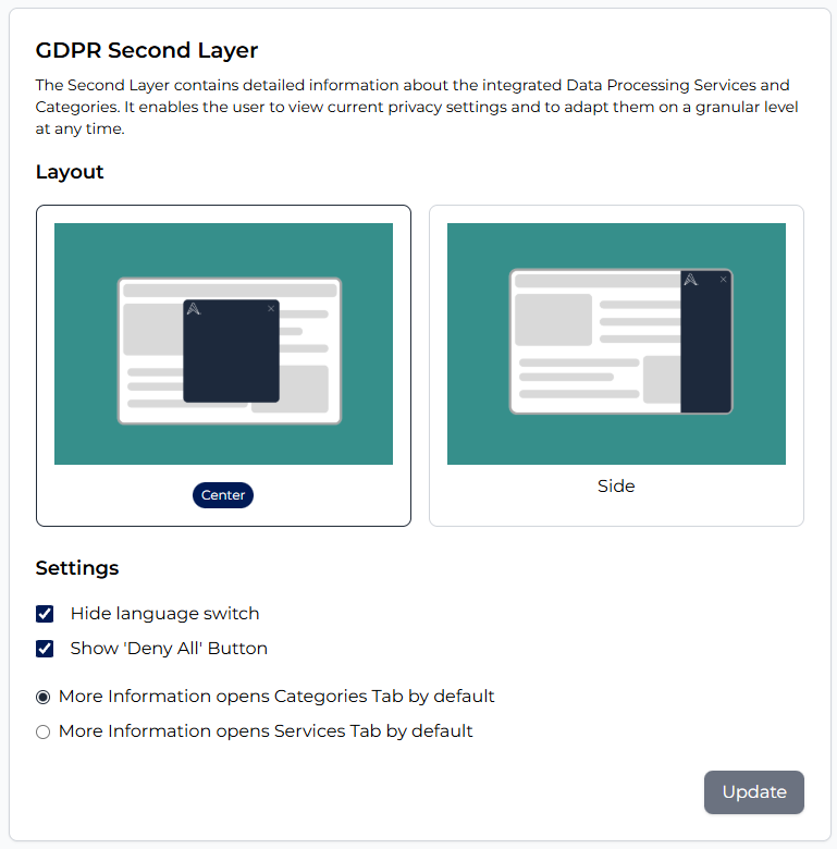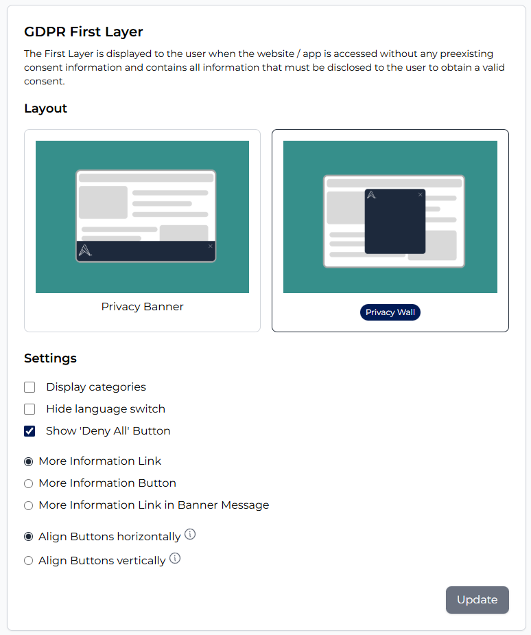 The First Layer is the consent banner users see when they visit the website for the first time.