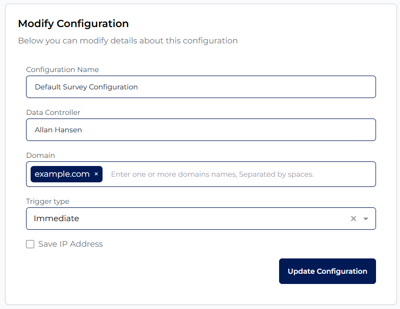 A. Access Domain Management Step 1: Open the Survey app from the left navigation. Step 2: Select the survey configuration you want to manage. Step 3: Click the Domains tab. You will see a list of all domains allowed for this survey configuration. B. ...