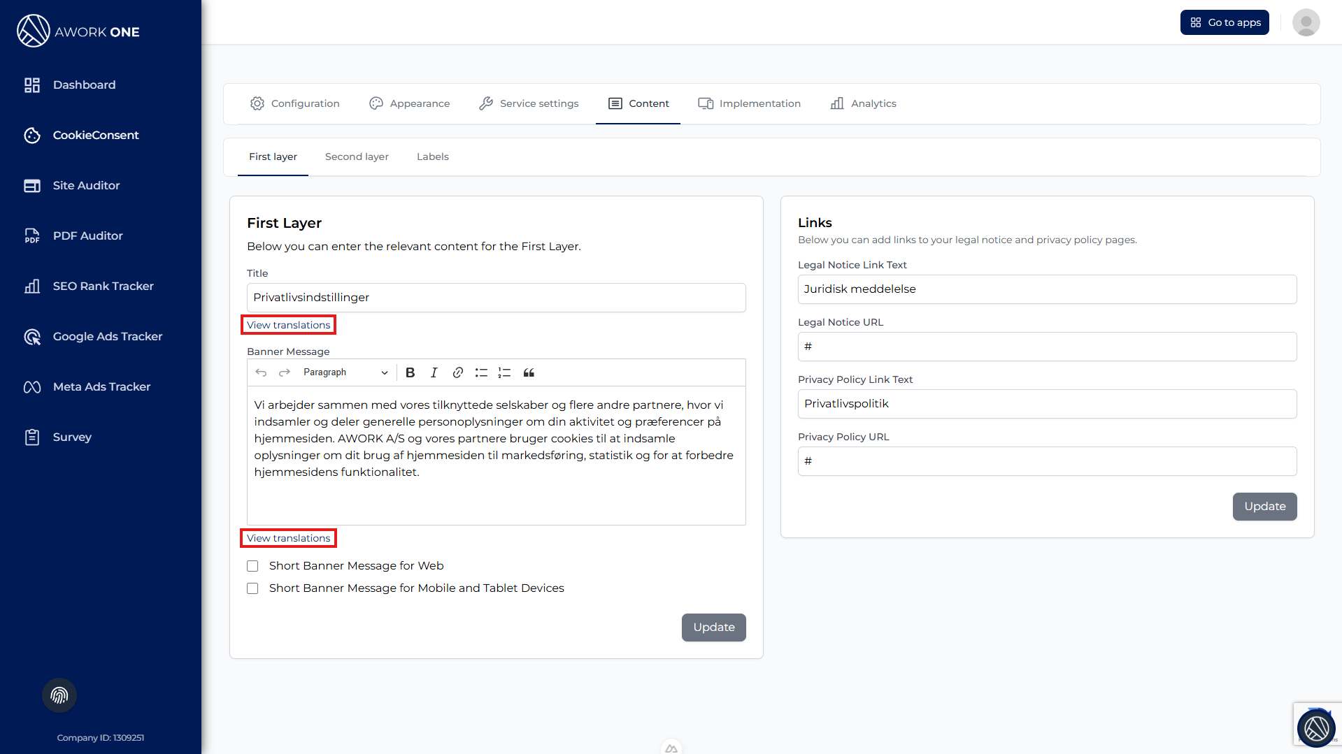 Legal Notice text and URL