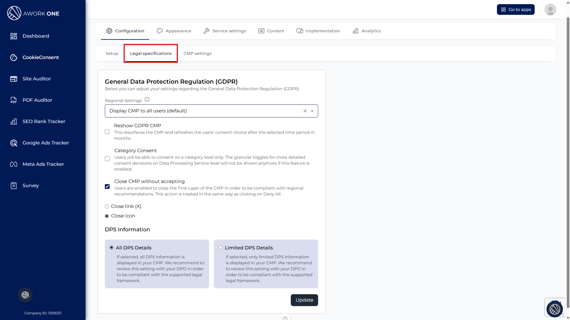 Step 1: Enable this to allow users to close the CMP without accepting.