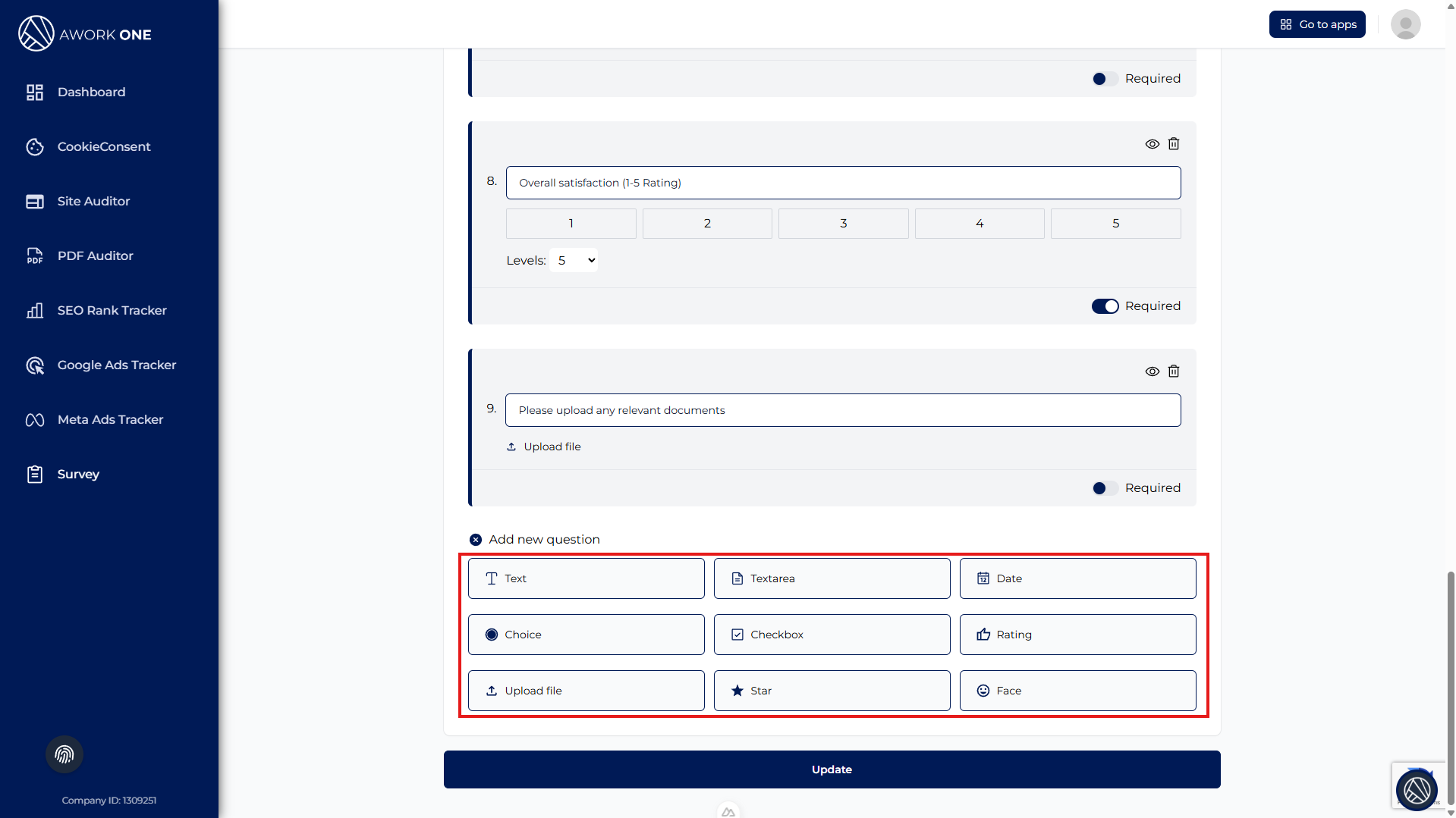 Choose a question type (text, textarea, date, choice, rating, upload, stars, faces, etc.)
