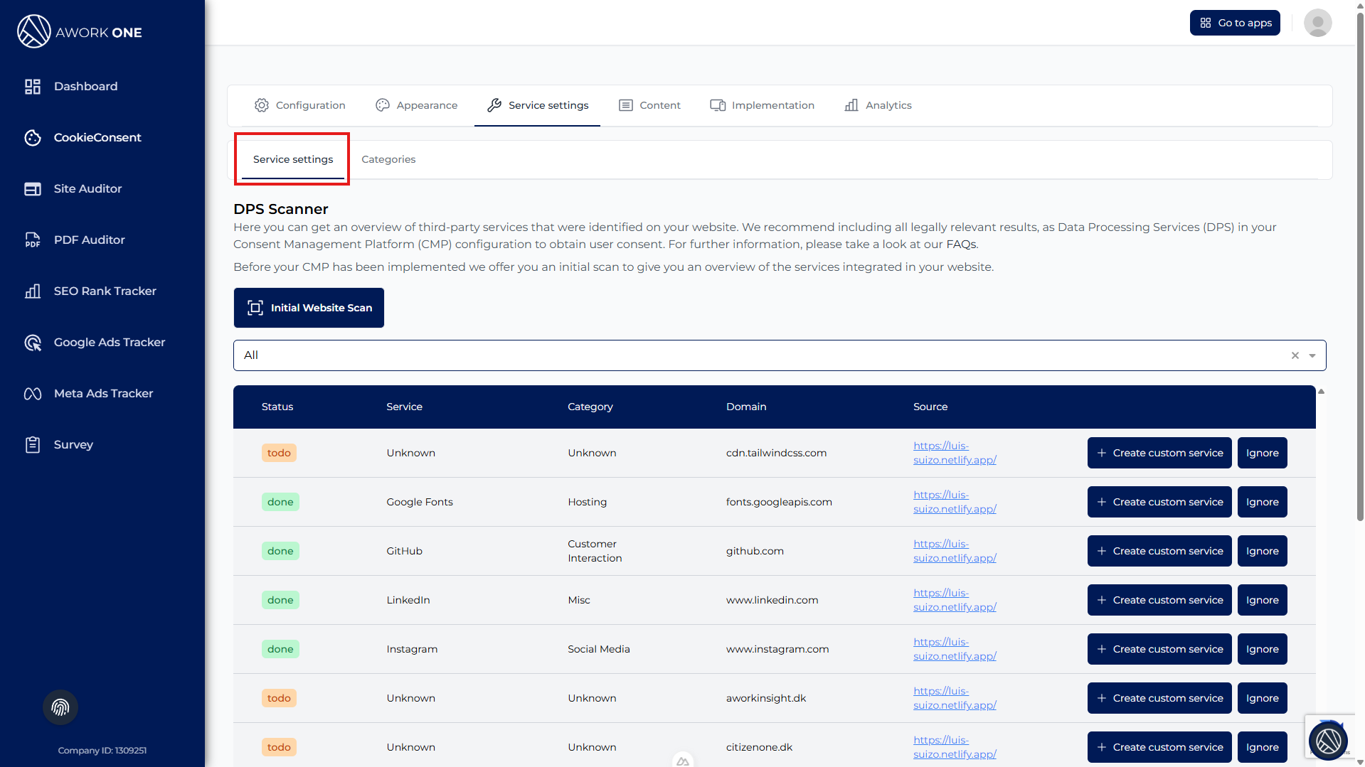 The system will crawl your website and automatically detect third-party services.