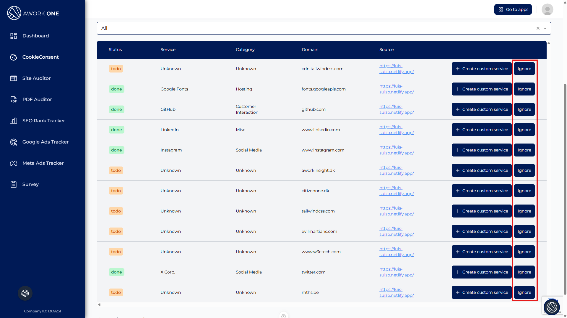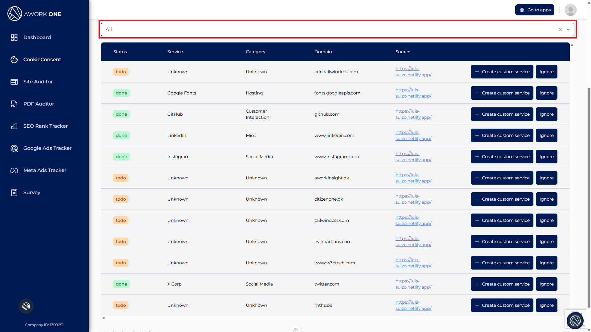 Service – Name of the detected service (e.g. Google Fonts, GitHub, Instagram).