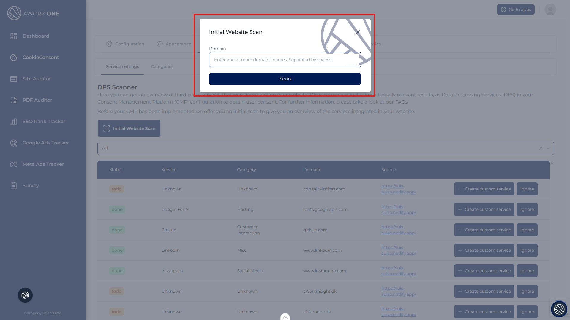 Step 6: In the Initial Website Scan popup, enter one or more domain names